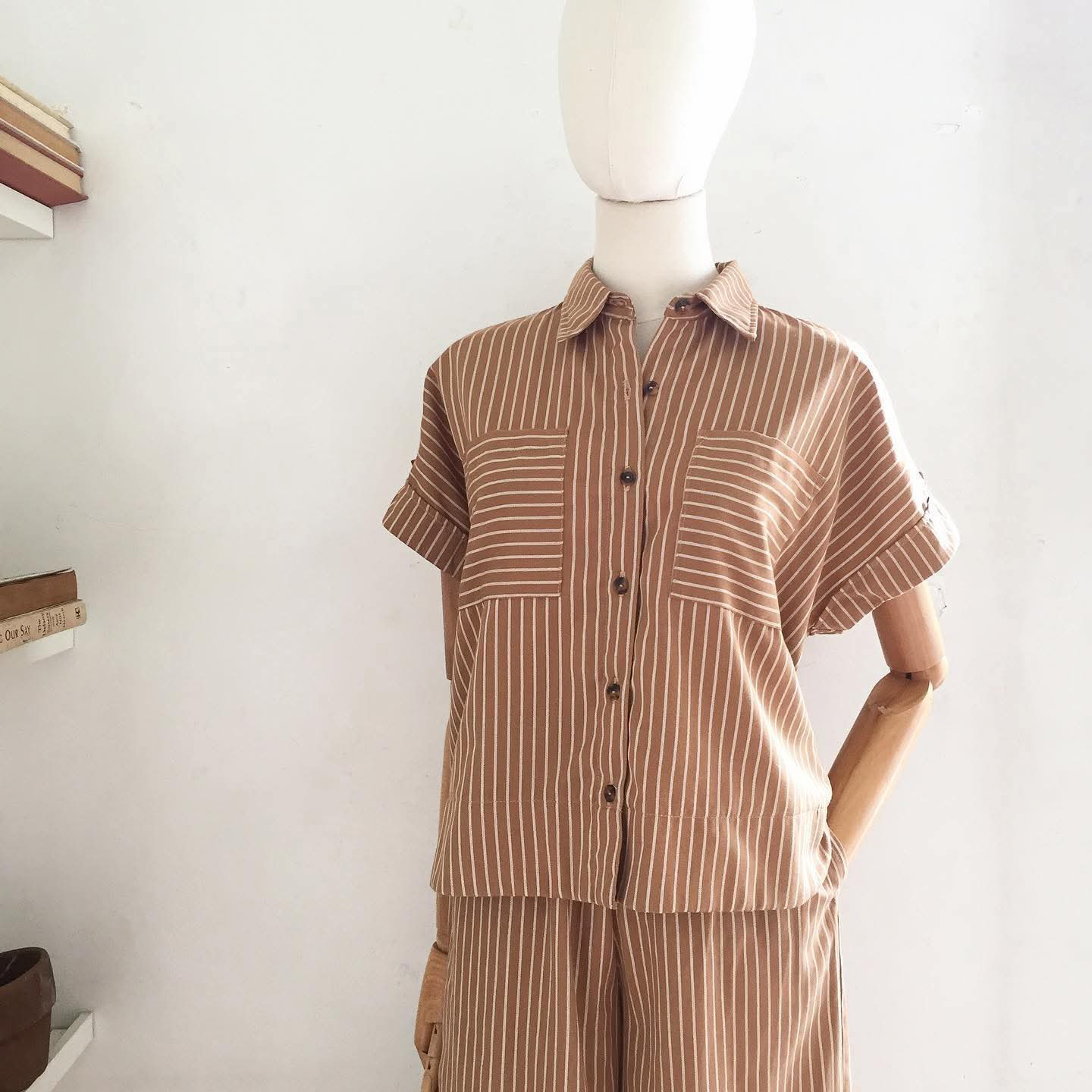 • Polycotton in camel / off-white stripes